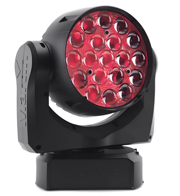 Cabeza móvil wash LED de alta gama que combina un haz brillante con un exclusivo efecto de aura brillante alrededor del lente. Ideal para escenarios, giras y producciones que buscan un look moderno, colorido y profesional.